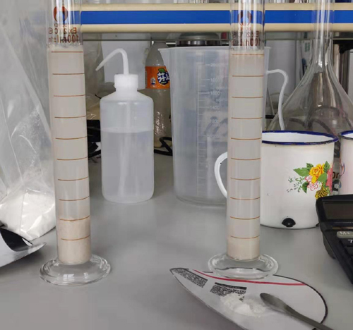 4、將量筒放置于不受振動的臺面上,靜置24小時,讀出沉淀物界面的刻度值,即為膨脹倍,以毫升/克樣表示。